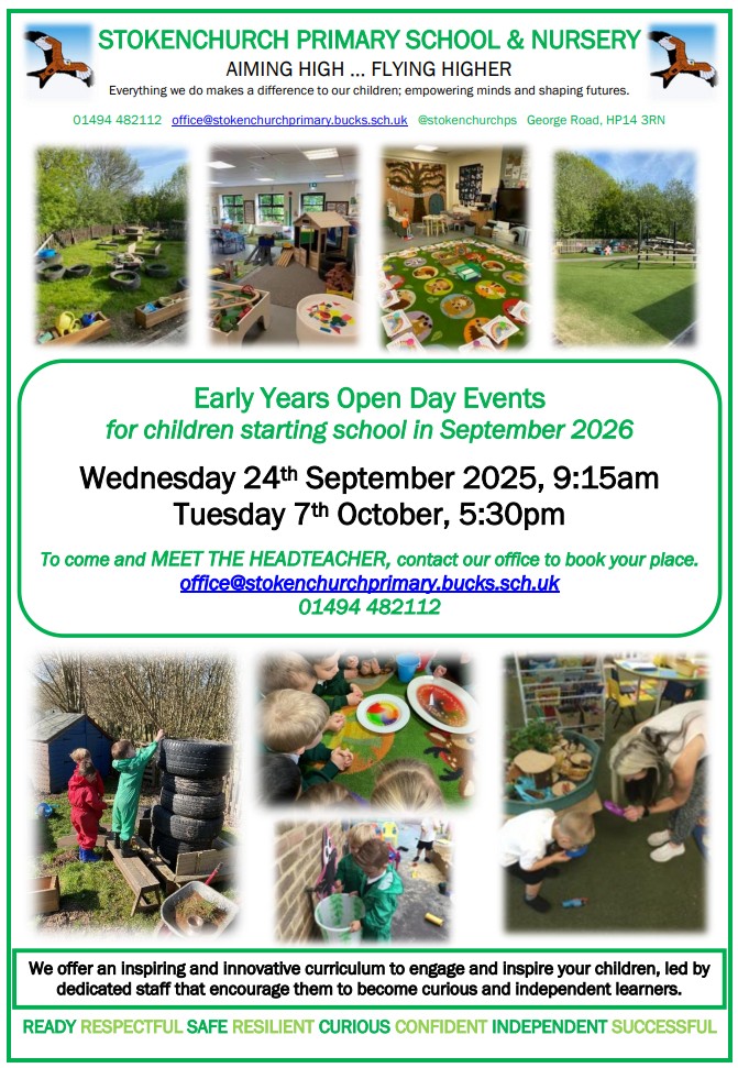 Welcome to Stokenchurch Primary School and Nursery! Starting school is such an exciting milestone, and we are delighted that you are considering our Reception class for your child. On this page, you will find our Welcome Meeting presentation which introduces life in Reception and gives you an insight into our school values, routines and learning environment which will be shared at our Open Days. If you have any questions, please don’t hesitate to contact us at office@stokenchurchprimary.bucks.sch.uk. We also encourage you to take a look at our Open Day poster below for details of upcoming opportunities to visit us in person.